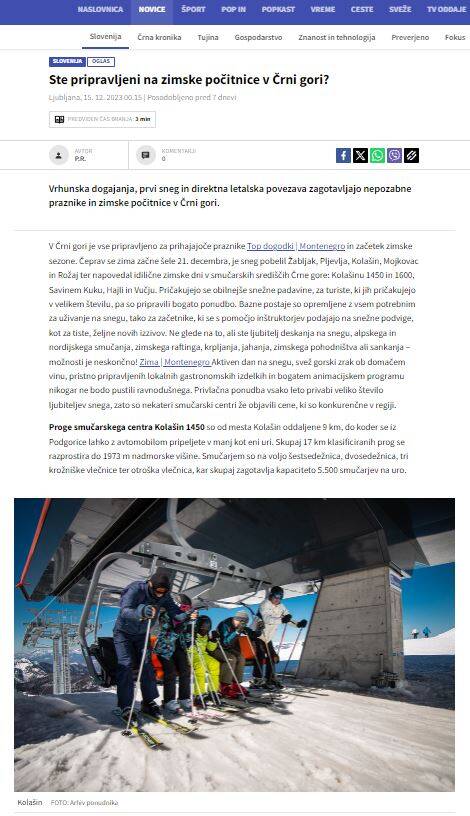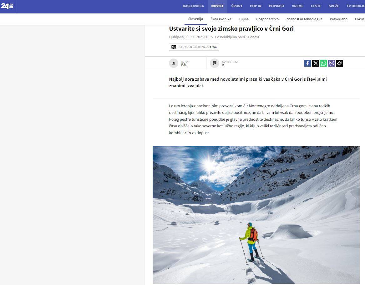 Četiri članka o Crnoj Gori i atraktivne fotografije destinacije objavljene su na najčitanijem portalu u Sloveniji – 24ur, koji broji preko 900 hiljada na mjesečnom nivou. Milionskom auditorijumu je predstavljena zimska turistička ponuda, bogat novogodišnji program, kao i jedinstvene prirodne ljepote Crne Gore.
