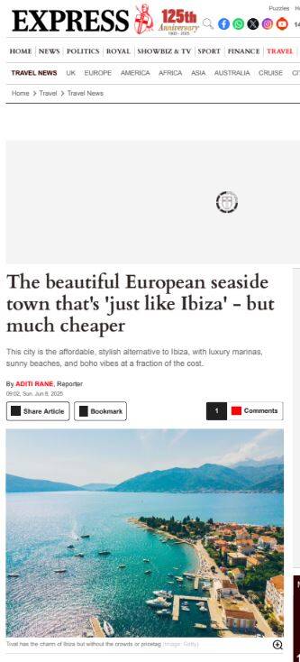 Crna Gora je privukla pažnju i drugih uticajnih britanskih medija. Portal Express objavio je više tekstova u kojima Crnu Goru opisuje kao atraktivnu alternativu poznatim evropskim destinacijama poput Grčke, Španije i Portugala, posebno naglašavajući povoljnije cijene. U jednom od članaka Tivat je opisan kao „Ibica, ali znatno povoljnija“, što dodatno potvrđuje percepciju Crne Gore kao moderne i pristupačne destinacije.